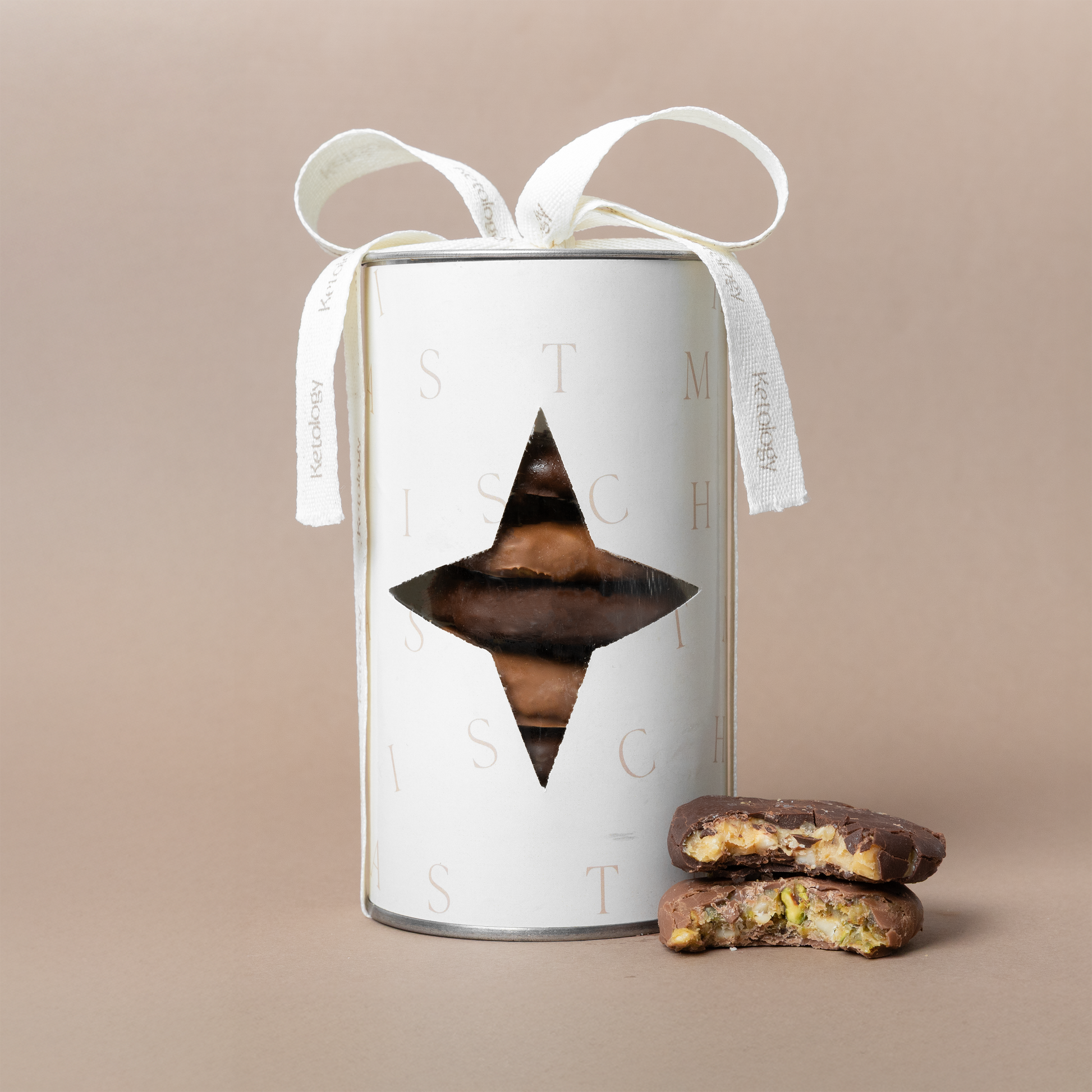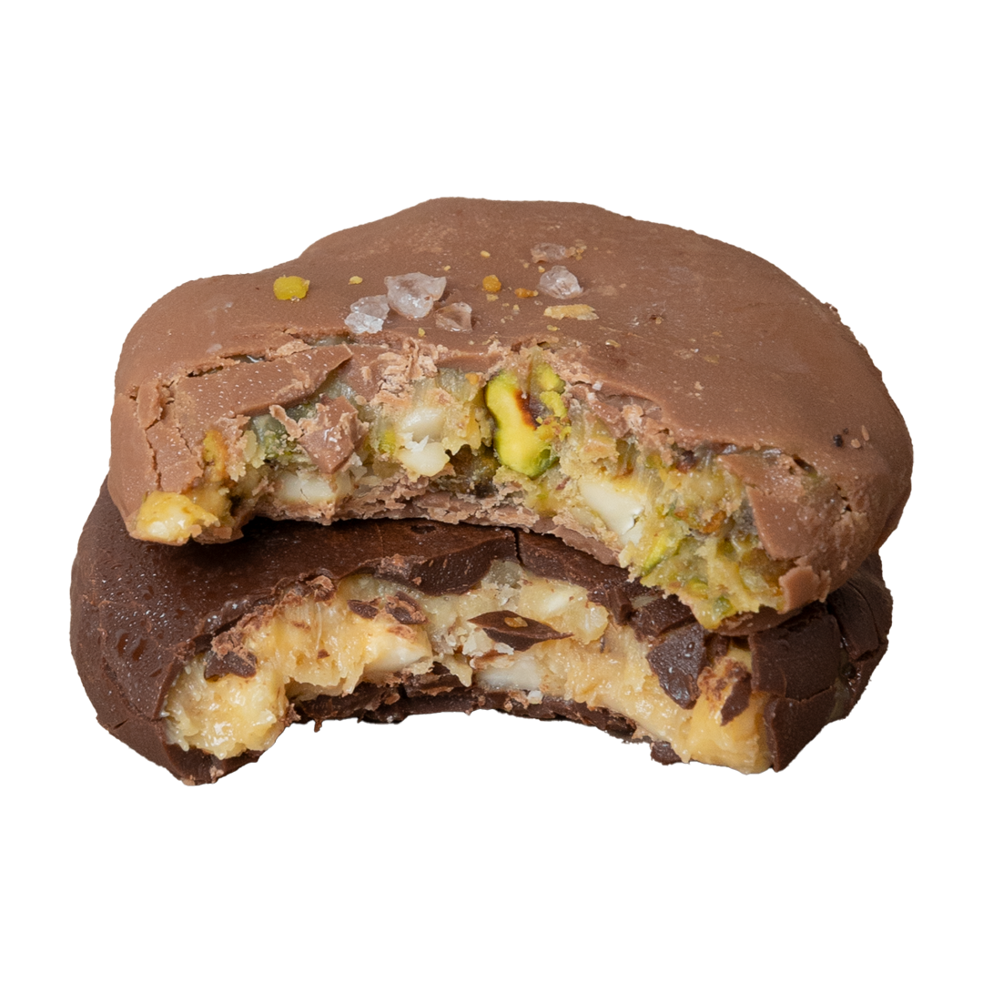 Deliciosa tortuga rellena de pistache salado y caramelo sin azúcar, cubierta con chocolate con leche sin azúcar. Dulce, suave y con el crunch perfecto.